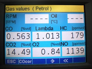 The HC is still low, thats because there isnt so much unburned fuel, but CO & CO2 are high while the O2 reading is extremely low. That is because the engine is running at a moderately rich mixture.